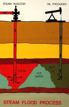 Steam injection is the most advanced and most widely used EOR process. It has been successfully used in some reservoirs in California since the mid-1960’s. There are two versions of the process: cyclic steam and steam drive. In the first, high-pressure steam or steam and hot water is injected into a well for a period of days or weeks. The injection is stopped and the reservoir is allowed to “soak.” After a few days or weeks, the well is allowed to backflow to the surface. Pressure in the producing well is allowed to decrease and some of the water that condensed from steam during injection or that was injected as hot water then vaporizes and drives heated oil toward the producing well.
