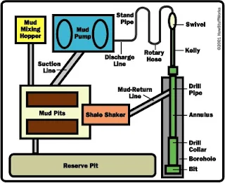 · Mud Circulation system - pumps drilling mud (mixture of water, clay, weighting material and chemicals, used to lift rock cuttings from the drill bit to the surface) under pressure through the kelly, rotary table, drill pipes and drill collars